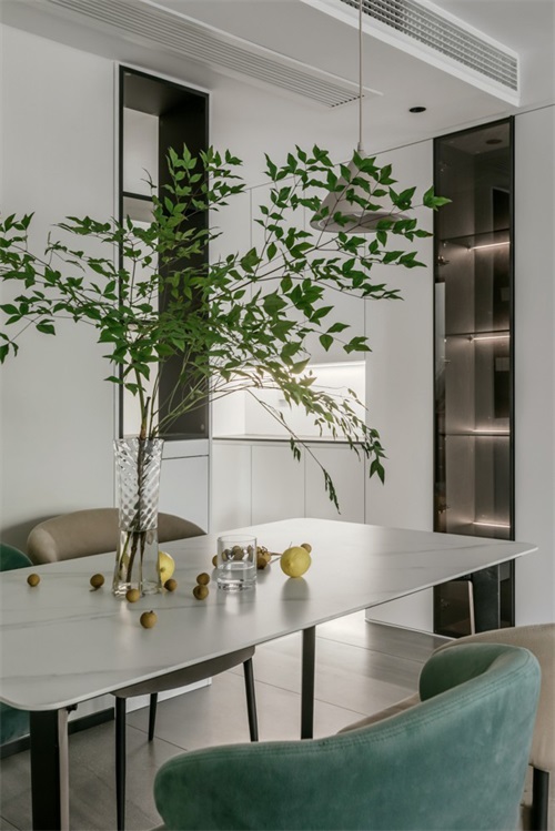 餐廳一張簡約的白色餐桌搭配淺綠色的柔軟椅凳,桌上用綠植裝飾看起來更舒適富有生機感,旁邊打造沿墻式的墻柜收納。
