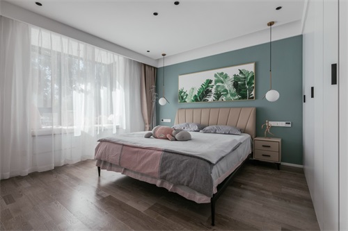 臥室以清新的綠色背景做裝飾,搭配深綠色的掛畫裝飾,簡約的大床和原木色的地板,沒有顯得違和反而多了一些小清新感覺。