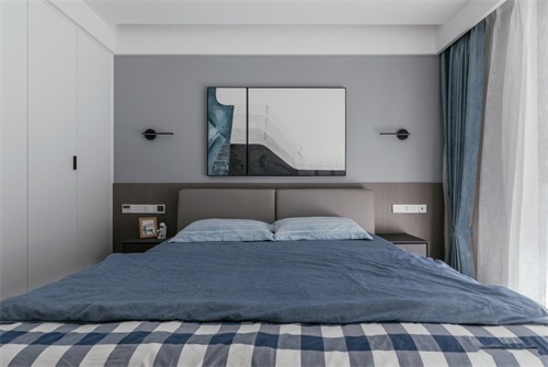 次臥上面顏色相對比較沉靜,拼接色澤的背景墻面搭配灰色的床,軟裝采用灰藍色的窗簾和床品,有一種冷冽的清新感。