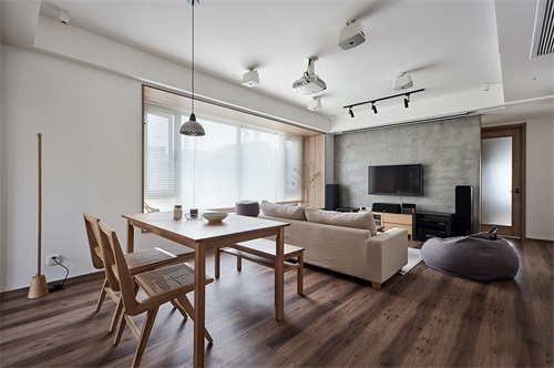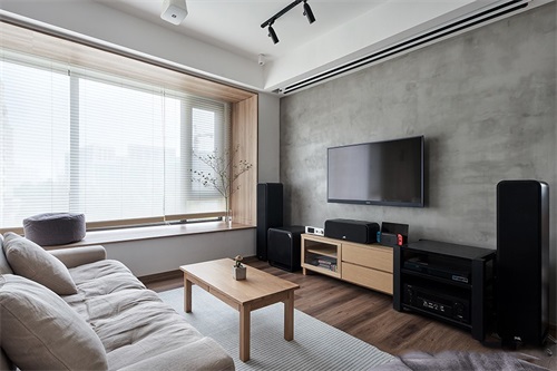 原生態(tài)的水泥墻作為電視背景墻面與黑色電器音響搭配起來(lái)似乎更相配。實(shí)用性強(qiáng)可移動(dòng)的小木桌。