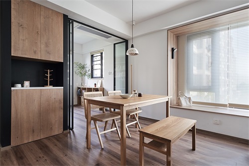 簡(jiǎn)約的木質(zhì)餐桌搭配同款椅凳,旁邊同樣設(shè)計(jì)一個(gè)餐邊柜置物,減輕廚房收納的負(fù)擔(dān)。一盞溫馨的吊頂別提多舒適了。