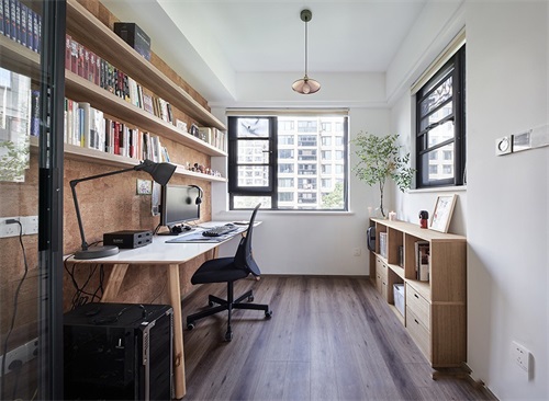 書房空間不大,墻面采用木頭做成置物隔板一張簡(jiǎn)約的辦公桌,窗戶帶來(lái)充分的光線和通風(fēng),簡(jiǎn)約又舒適。