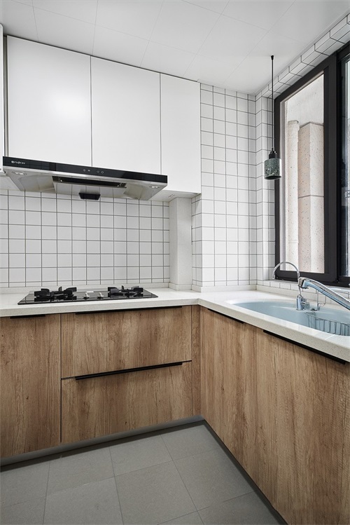 廚房雖然不大但是小小的空間卻有大大的能量,網(wǎng)紅小白磚作為墻面原木色的櫥柜設(shè)計(jì),上柜加下柜組合增加空間收納。