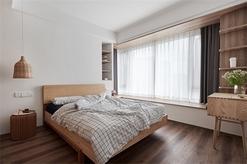 純白色的墻面和原木色的飄窗設(shè)計(jì),臥室給人簡(jiǎn)單的溫馨,床頭利用墻面打造壁龕收納,飄窗也利用墻面打造置物臺(tái)增加收納。