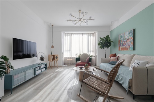 客廳整體設(shè)計上通過白色與淺綠色的墻面作為主色板,再通過各類家具的搭配組合空間寬敞明亮,十分有格調(diào)。