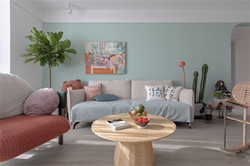 淡綠色的背景墻加上綠植和童趣的藝術(shù)畫裝飾,一張米色的雙人沙發(fā)別提有多清新別致。