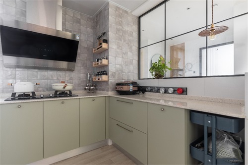 U型的廚臺結(jié)構(gòu)打造流暢形的廚房動線,操作臺備菜區(qū)域設(shè)計多個可移動的插座方便后期電器的增加和使用,半墻式的窗戶給廚房增加充足的光線。