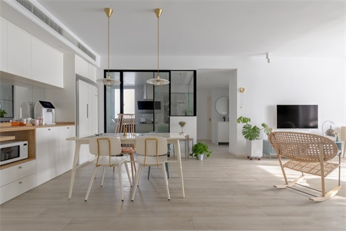 餐廳外面同時打造一排西餐臺,旁邊設(shè)計一張簡約的餐桌和椅凳,日常簡約的早餐都可以在這里準備,白色的上下柜門收納同時減輕了廚房的收納壓力。