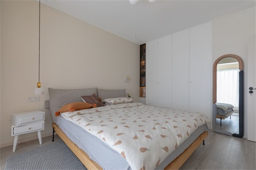 主臥上利用淺黃色的暖調(diào)背景墻面搭配淺灰色的床品溫柔又簡約,沿墻面是嵌入墻體的衣柜沒有突出的突兀感更增加空間利用率顯得寬敞。