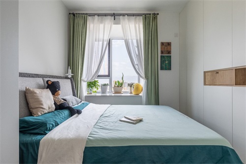 次臥完全通過軟裝來調(diào)配,白色的墻面可做任意風格的搭配,湖綠色的床品與窗簾呼應(yīng),顯得深淺有致,床尾沿墻打造了一整排的墻柜收納,