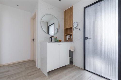 衛(wèi)生間的洗漱臺外置更方便日常使用,墻面打造壁龕收納加上洗漱柜日常收納不成問題,淋浴間跟馬桶區(qū)用玻璃隔斷,使用互不影響。