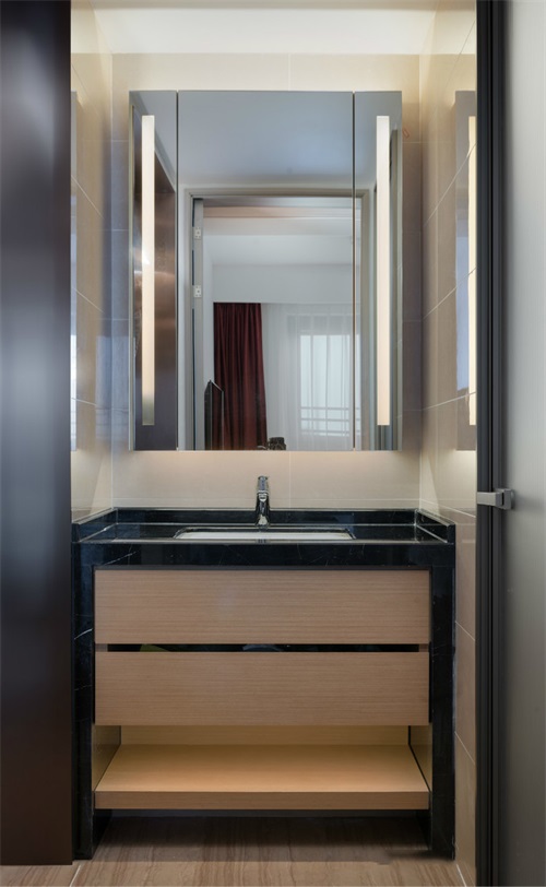 衛(wèi)生間洗漱臺外置在夾角處,柜鏡兩邊都安裝壁掛燈,洗漱臺一體式下面可以做成收納置物的空間更實(shí)用和更擋板。