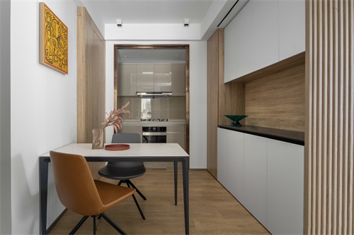 U型的廚臺設(shè)計(jì)空間不大但是足夠屋主一個人的生活需求,廚房出來是沿著墻面做的收納,后期電器增加也可以完美置放減少廚房的存儲壓力,黑白色餐桌搭配簡約的雙人椅凳。