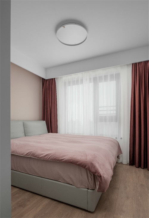 主臥背景墻面采用淺色的粉橙調(diào)質(zhì)感溫馨,利用深暖色的窗簾和粉調(diào)床上用品,既有少女心又具備生活需求的滿足。