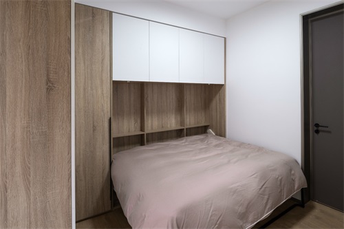 次臥做的是多工能床設(shè)計(jì),日常把床架收上去就是一個獨(dú)立的空間,放下來就是一件次臥了,墻柜增加了空間的存儲。