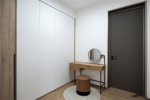 獨(dú)立衣帽間屋主可以有大量的存儲空間,一張?jiān)O(shè)計(jì)感的梳妝臺和一張舒適的小凳,沿墻是整面的隱形置物墻柜收納。